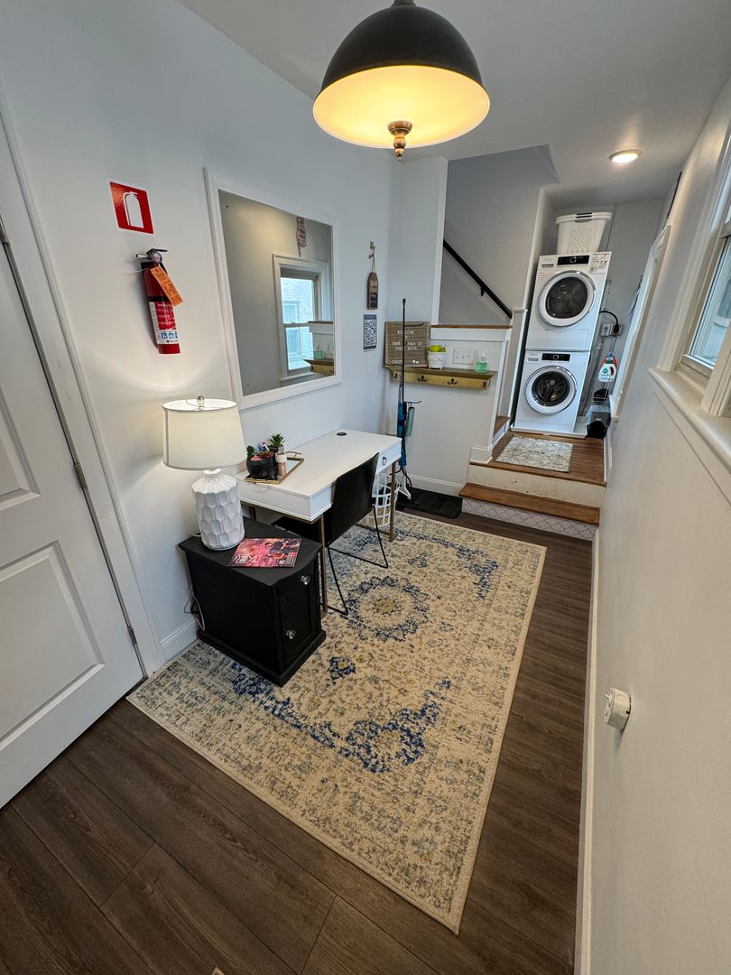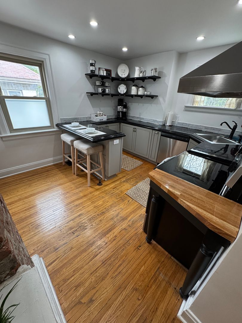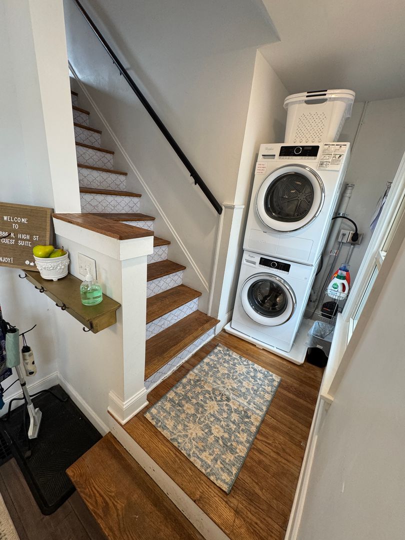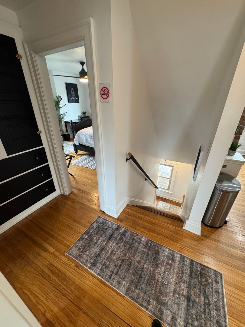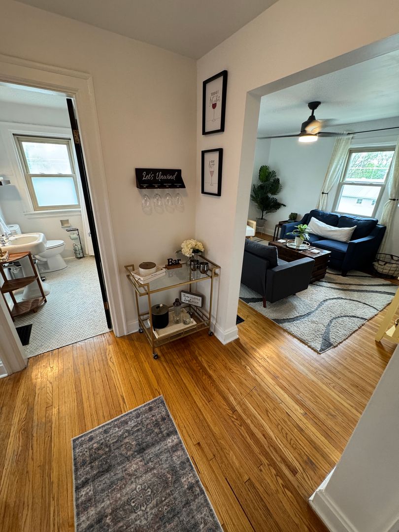 Fully furnished and stylish 2 bedroom apartment located above our rental office, in the heart of Clintonville, and includes ALL utilities. It features its own private entrance and designated off street parking space. It offers beautiful hardwood flooring throughout, an updated kitchen with all the appliances and supplies you would need, bar island seating for dining, a beautiful full bathroom with additional linen area, 2 large bedrooms both with large closets, queen sized beds, and individual smart Tv's. Large living room space with a second office area and 3rd smart TV. Designated office area on the first floor offers great lighting, and away from the main part of the unit, which makes working here from home an ideal set up. Private laundry in unit. Off Street parking, paver patio for relaxing, and so much more!