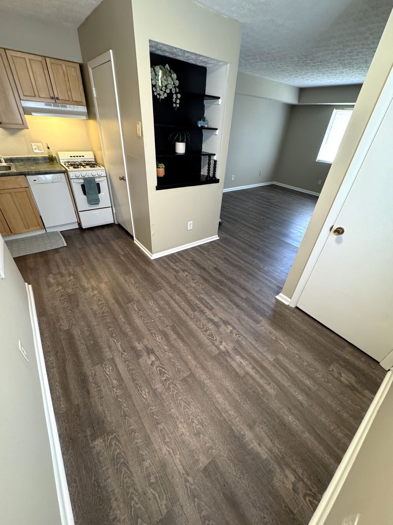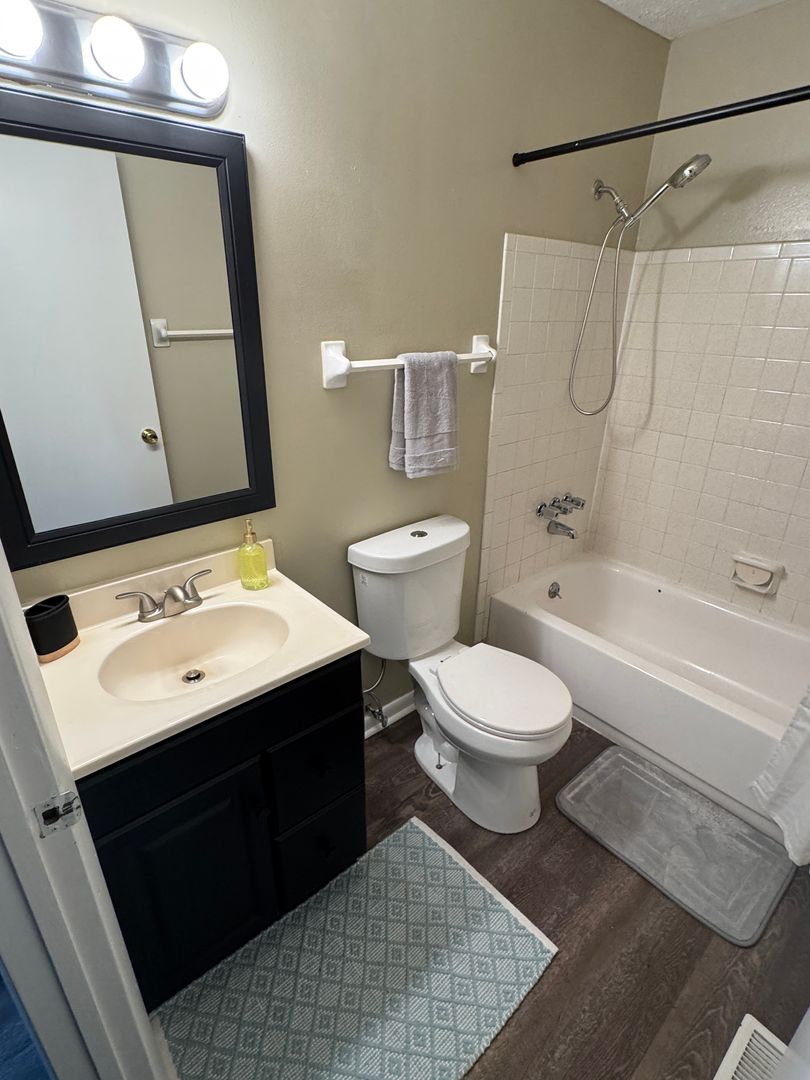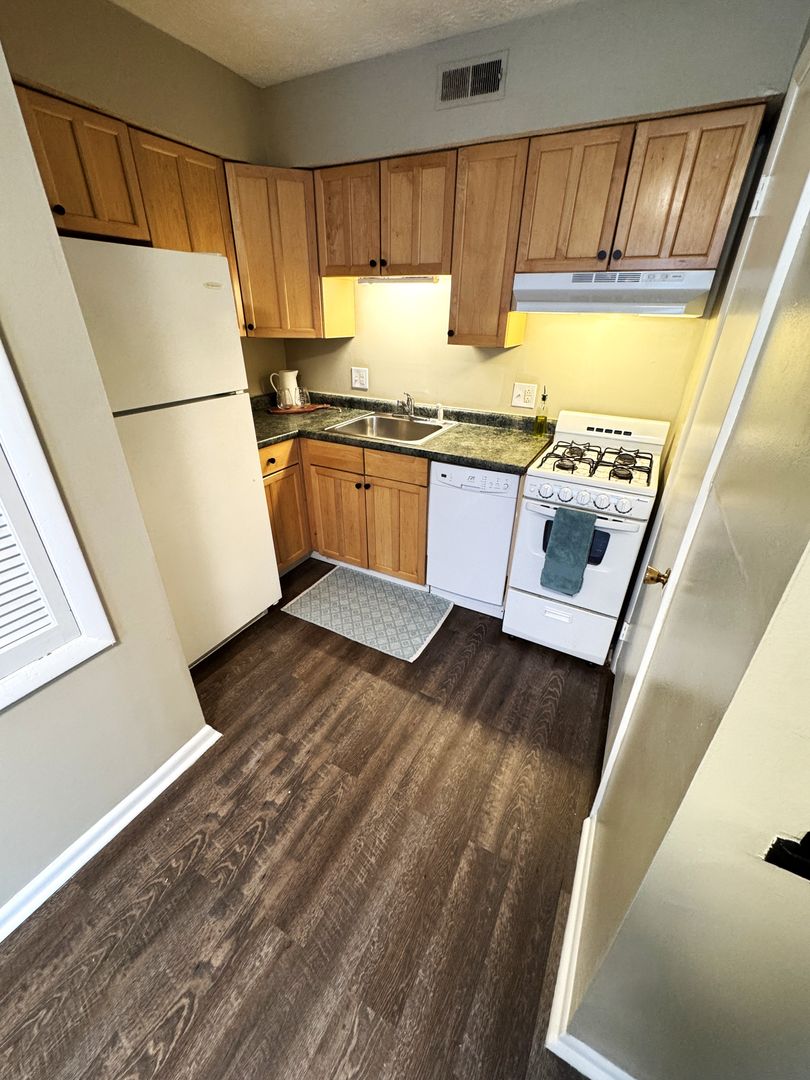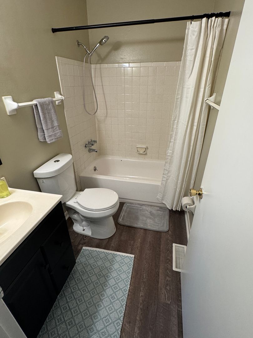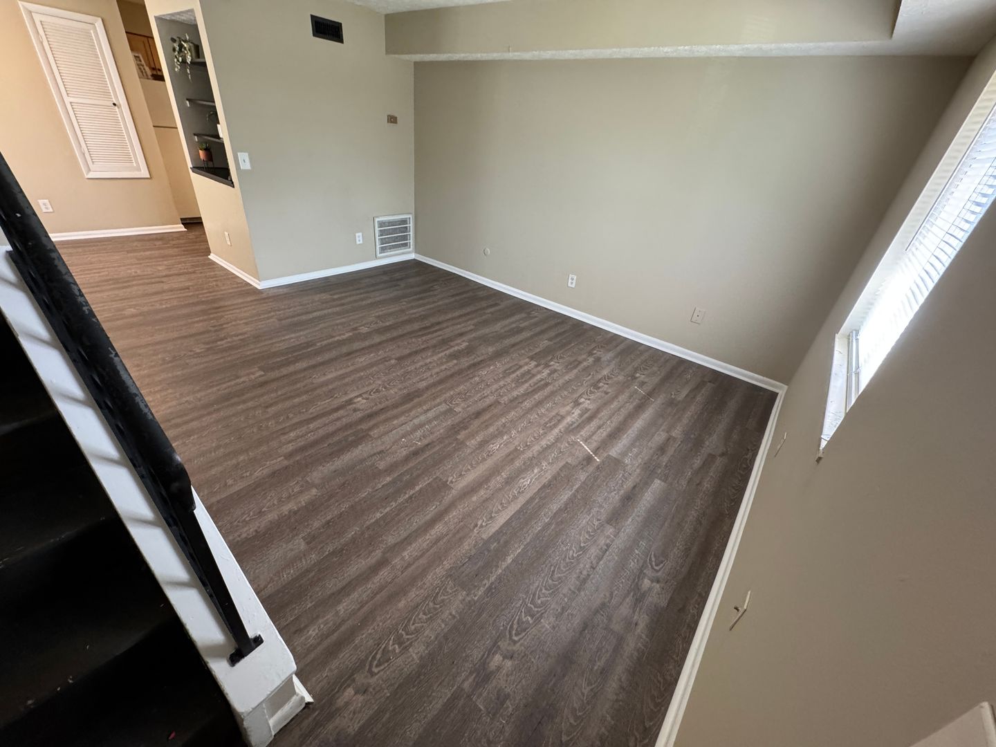 This is a fantastic 2 bedroom/1 bath townhouse style apartment. This unit greets you as you walk in with a great sized living room, additional dining room space, and full kitchen. Fridge, stove, and dishwasher are provided. Upstairs are 2 large bedrooms each with huge closets and a full bathroom. It also features central air, brand new LVP flooring throughout, endless storage space, on site laundry, individual front porch, free on and off street parking, and so much more!